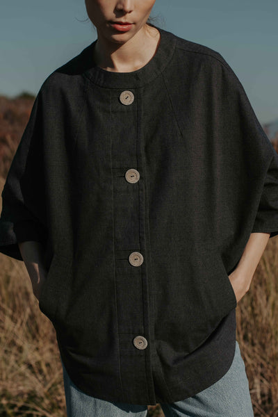 Confeccionado artesanalmente en lino y algodón, su corte oversize y manga japonesa evoca la elegancia clásica de campo. Un tema recurrente en nuestras colecciones. VER AQUÍ